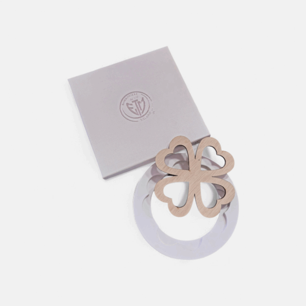 Delicato e simbolico, questo sottopentola quadrifoglio portafortuna in legno è una bomboniera raffinata e ricca di significato. Il design minimal con i quattro cuori che formano il quadrifoglio rappresenta fortuna, amore e felicità, rendendolo perfetto per celebrare i momenti più importanti della vita.