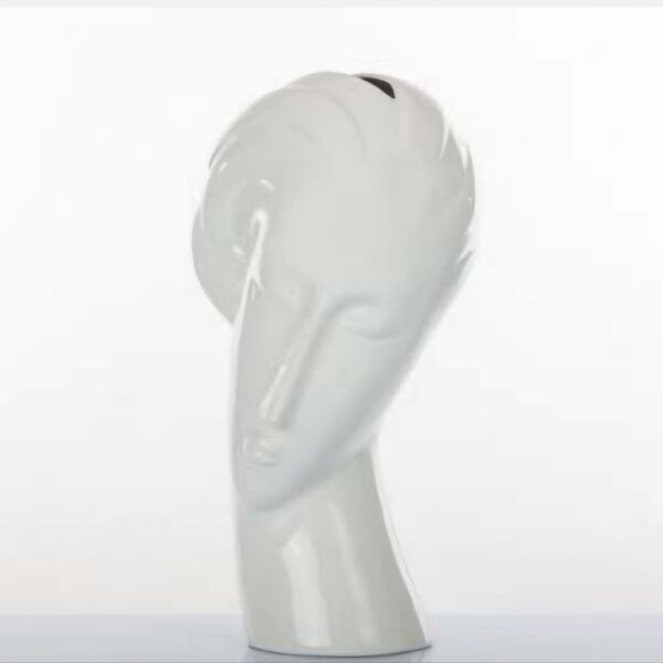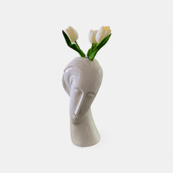 Vaso decorativo in ceramica a forma di volto stilizzato, dal design elegante e moderno. La finitura lucida color avorio esalta le linee artistiche, mentre l’apertura superiore permette di inserire fiori freschi o artificiali, creando un effetto scenografico unico. Ideale per arredare con stile qualsiasi ambiente, dalla zona living alla camera da letto.