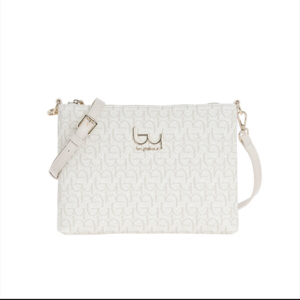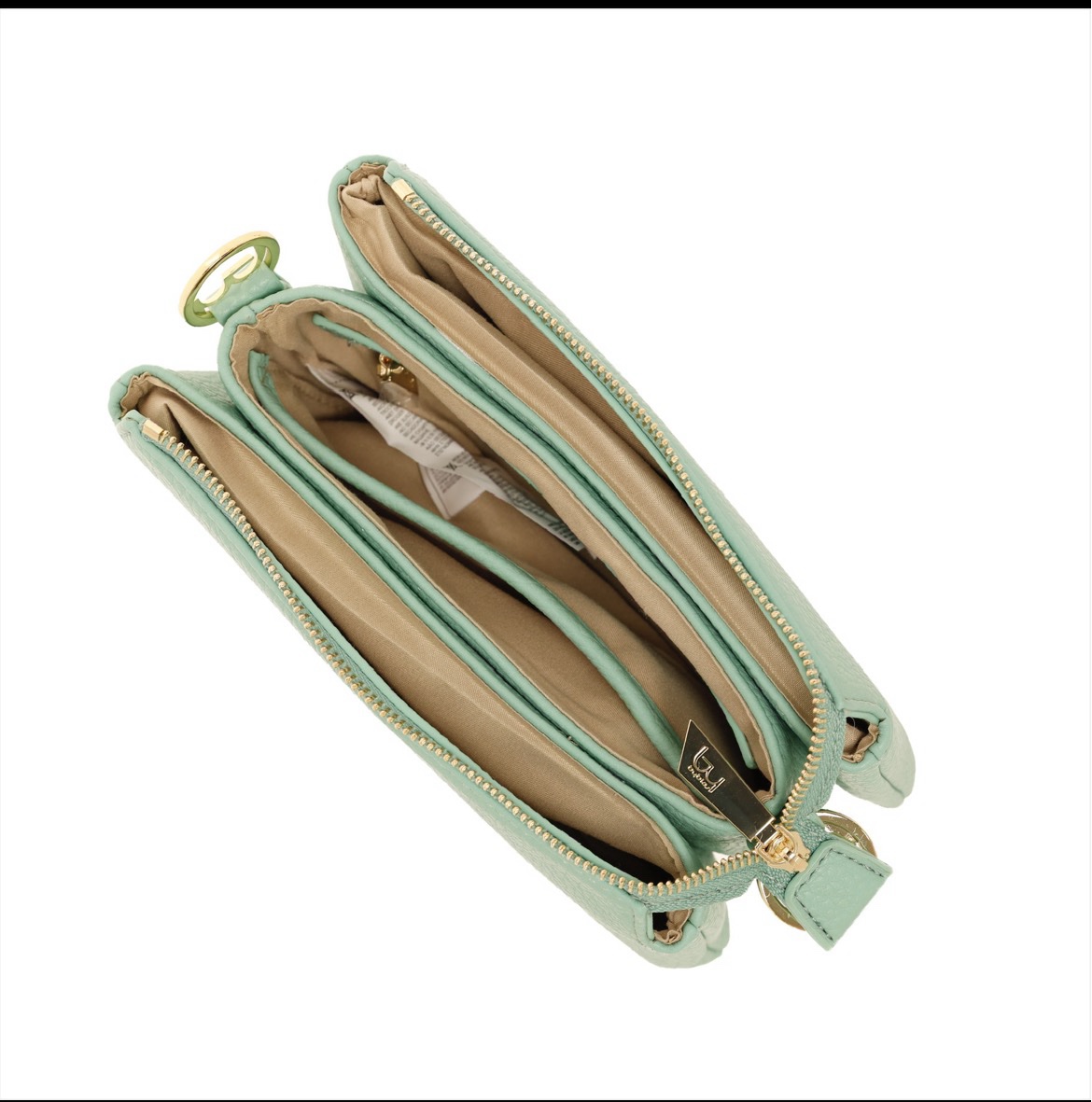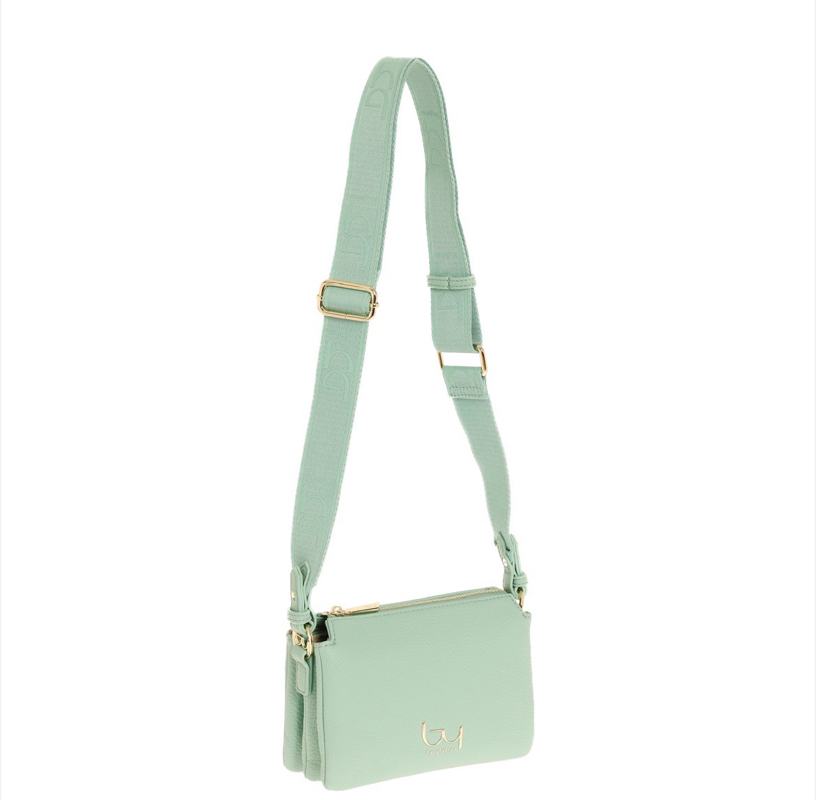 Borsa verde acqua by Byblos con design compatto e moderno, superficie leggermente testurizzata, logo frontale in metallo dorato e chiusura con zip. Il manico corto con nodi laterali e le finiture dorate aggiungono un tocco elegante, rendendola perfetta per look freschi e luminosi.
