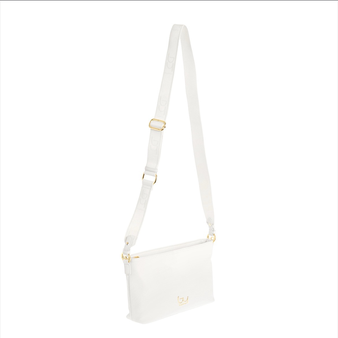 Borsa bianca by Byblos con linea pulita e moderna, realizzata con superficie liscia e dettagli in metallo dorato. Il logo frontale aggiunge un tocco elegante, mentre la tracolla regolabile garantisce praticità e comfort. Un modello essenziale e raffinato, perfetto per look quotidiani e outfit più curati.