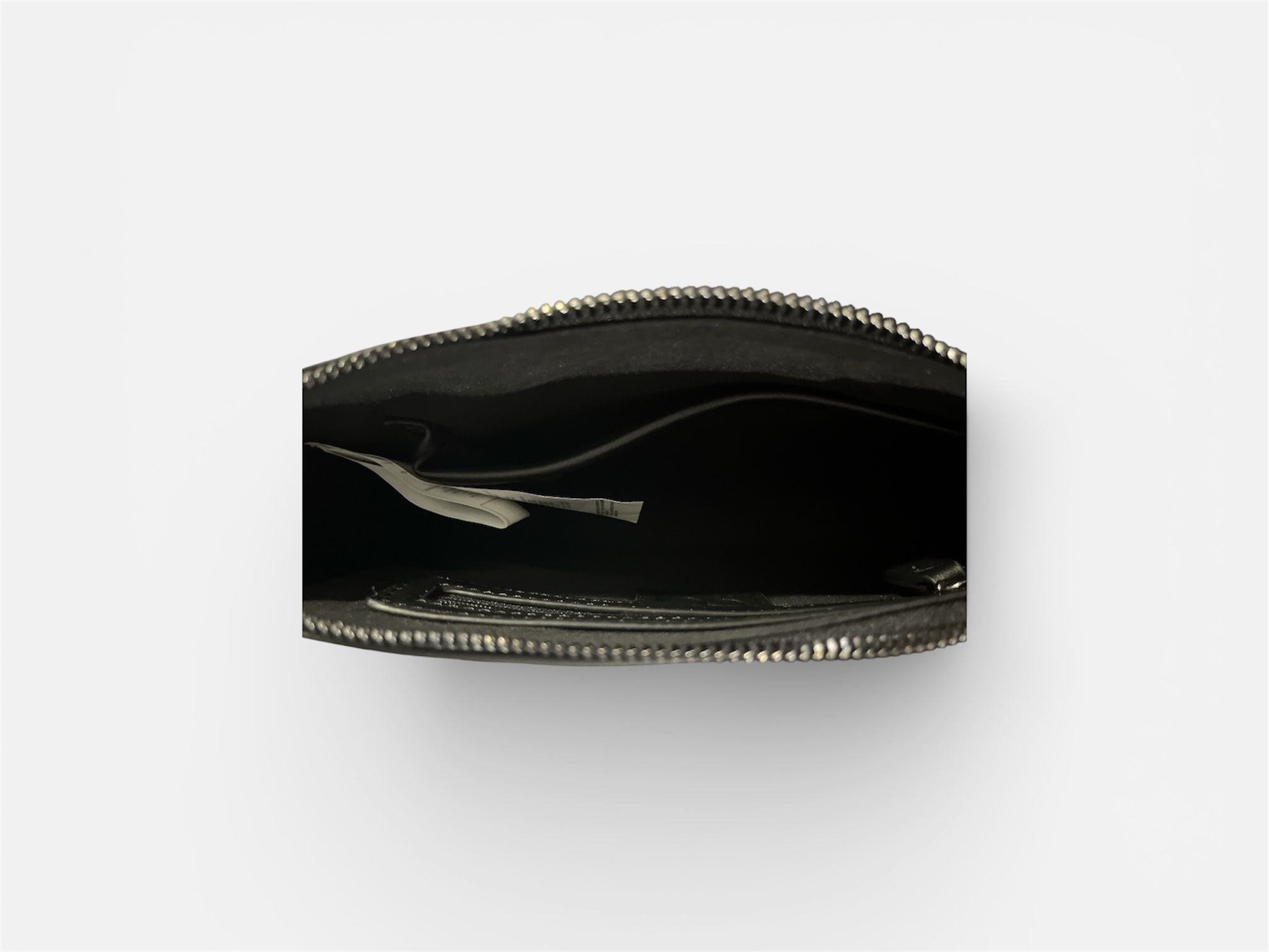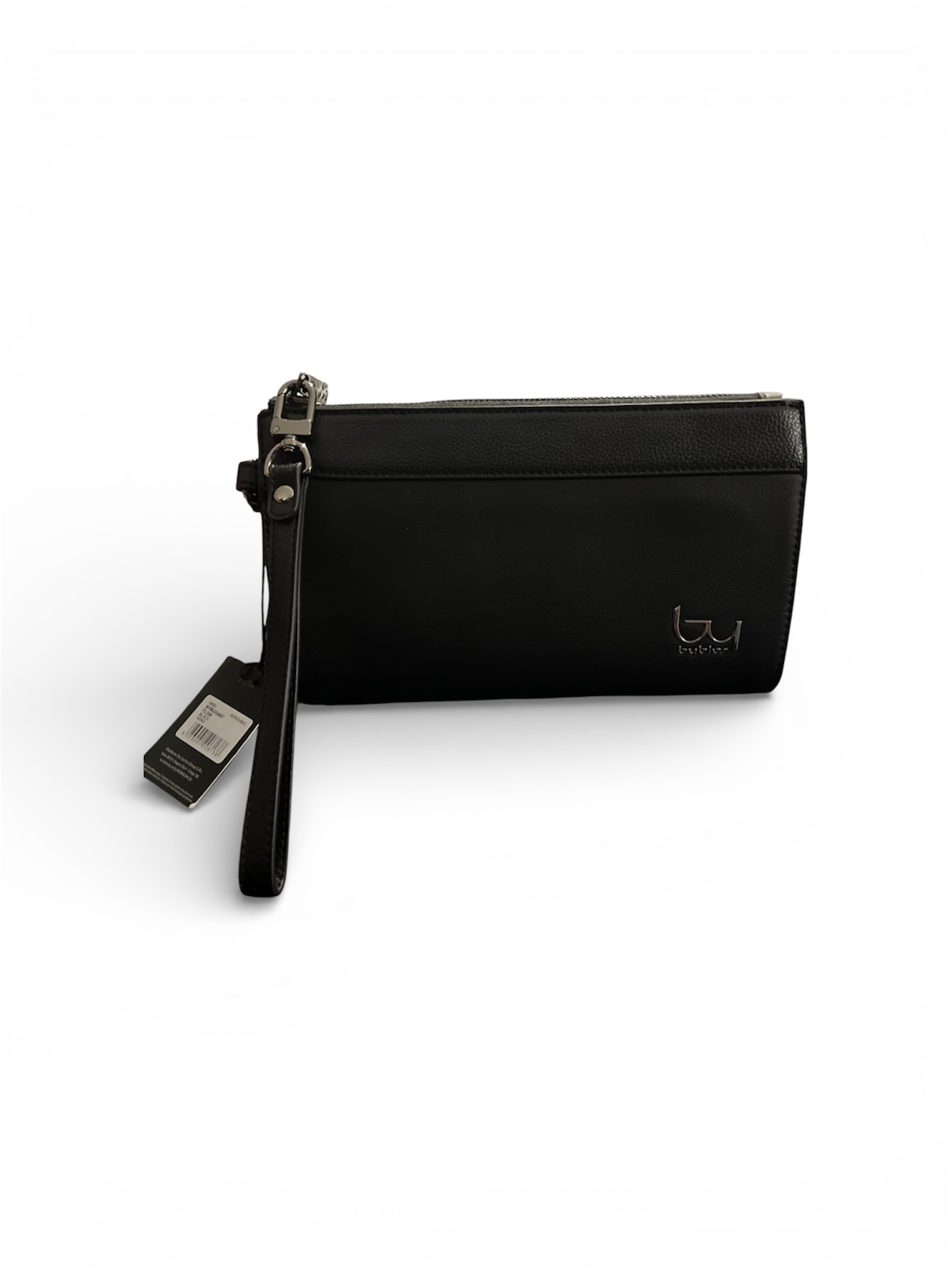 Borsa nera da uomo by Byblos con design essenziale e moderno, realizzata in materiale liscio e resistente, dotata di logo frontale in metallo dorato, chiusura con zip e cinturino da polso removibile. Le linee pulite e la tonalità nera la rendono un accessorio pratico e versatile, ideale per uno stile maschile sobrio e curato.