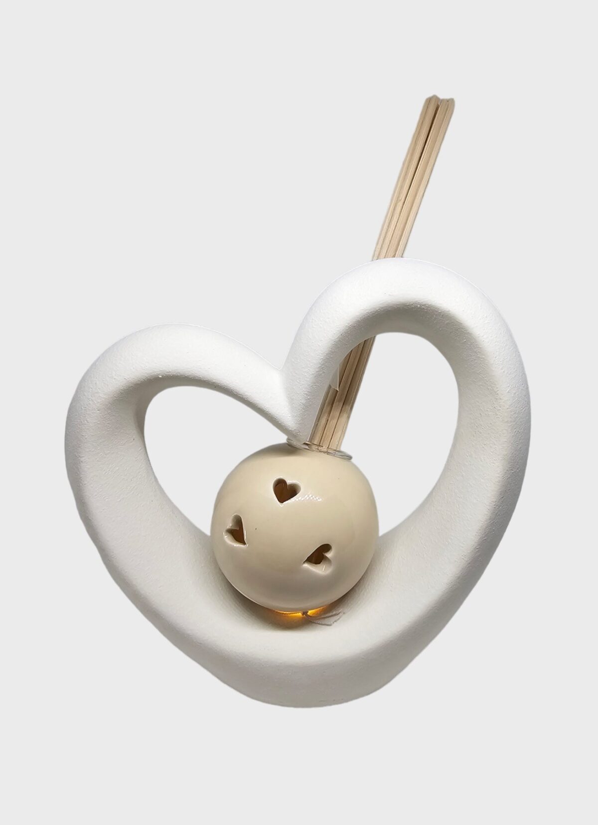 Bomboniera profumatore led cuore Karma Living 13×14, in ceramica opaca bianca e palla centrale in tortora lucida, essenza inclusa ed elegante scatola regalo, risulta essere ideale come bomboniera da matrimonio utile, per gli sposi in cerca di un ricordo che duri nel tempo e allo stesso tempo funzionale. Inoltre risulta perfetta anche per altre cerimonie, come anniversario, cresima, comunione, battesimo.