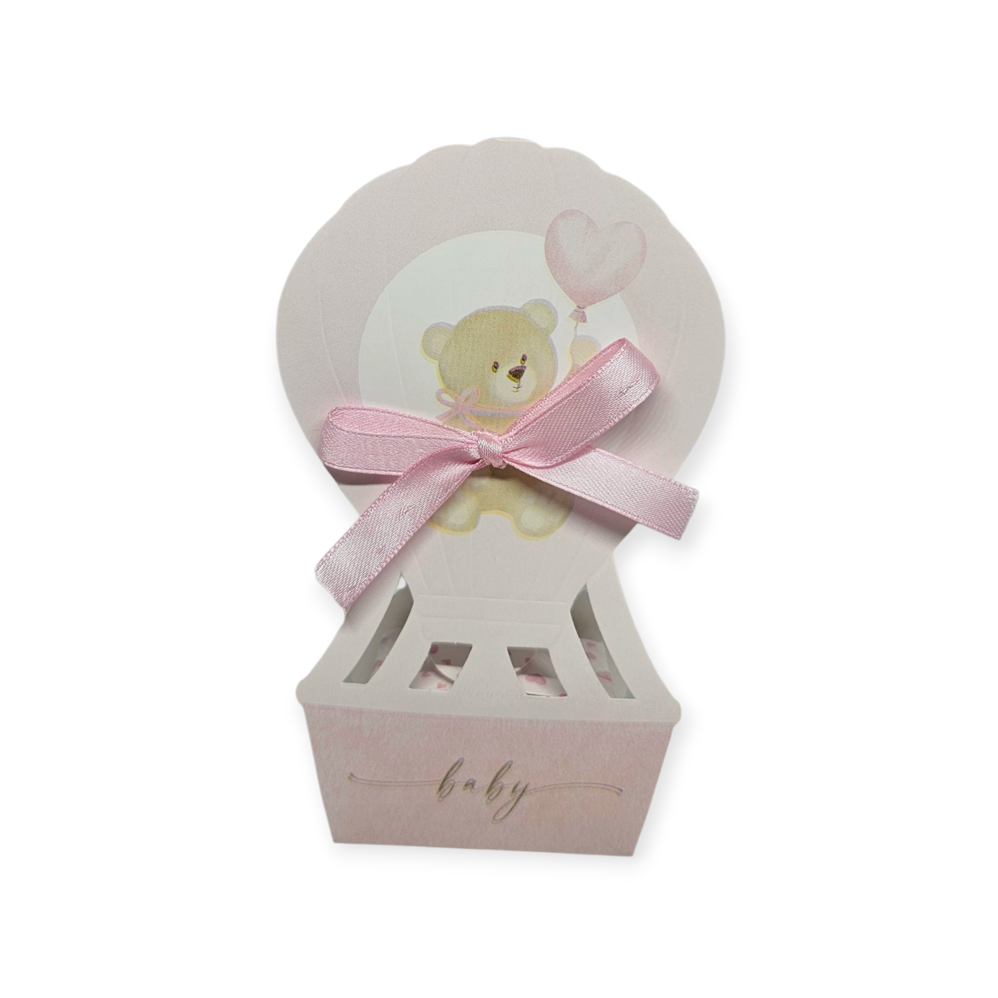 Scatola portaconfetti in cartoncino rosa a forma di mongolfiera, scritta baby e orsetto stampato. Bomboniera per nascita o per compleanni bimba.
